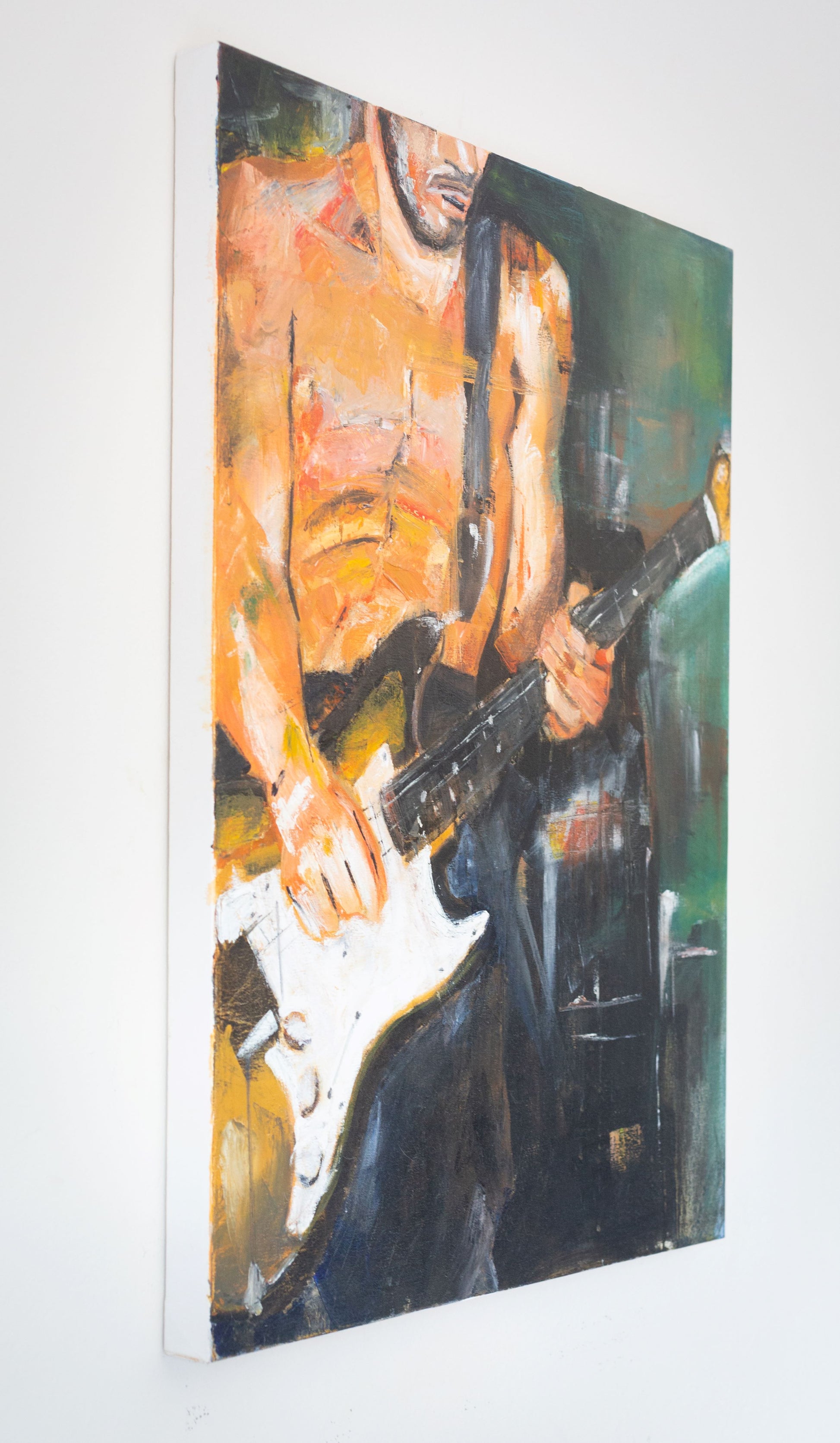 An original oil painting on canvas painting Of Red Hot Chili Peppers guitarist John Frusciante playing his Fender Stratocaster guitar. Known as one of the most iconic guitarists of the 90's the band is one of the biggest bands in the world with songs such as 'Under the Bridge', 'Give it Away' and 'Californication'