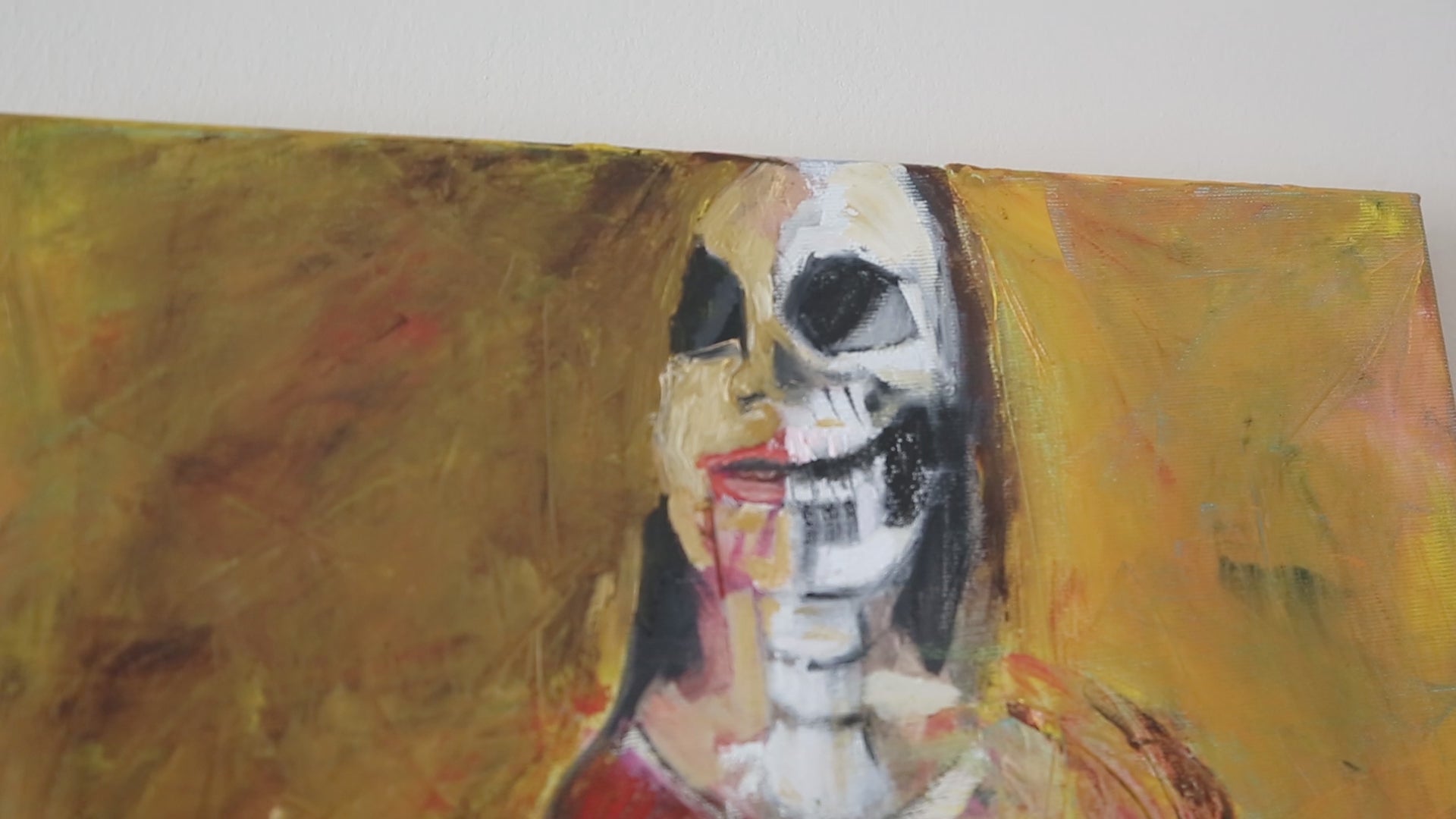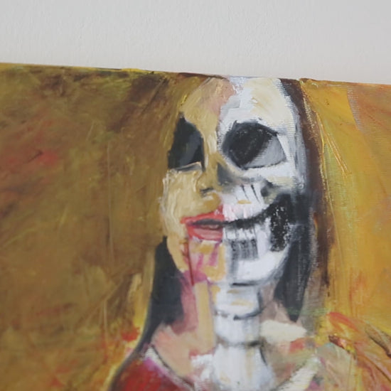 An original oil painting, one of a series of paintings featuring the zombie educator Miss Melina . Oil on Canvas size 40x50cm. Done with brushes and Pallet knives. It will look great on a living room wall or a home studio